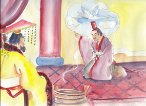 秦始皇的使者到了山上見到王次仲,把秦始皇的命令告訴王次仲。王次仲沒有生氣,也沒有說話,他變成了一隻美麗的大鳥,展開翅膀飛向藍藍的天空。使者又驚奇又害怕,跪在地上不斷的向天上的大鳥磕頭,嘴裡說道:“王次仲,您變成大鳥飛走了,我怎麼向秦始皇交代啊!秦始皇非殺了我不可!我現在知道您是一位神仙,神仙啊!求求您可憐可憐我吧!”大鳥在空中盤旋了一會兒,故意落下三根羽毛,使者只好拿著這三支羽毛回去見秦始皇。